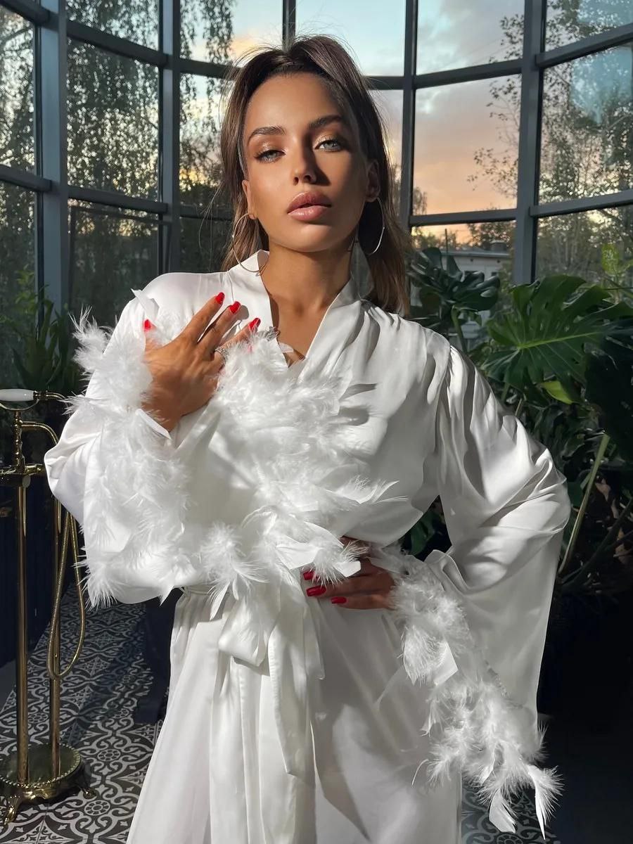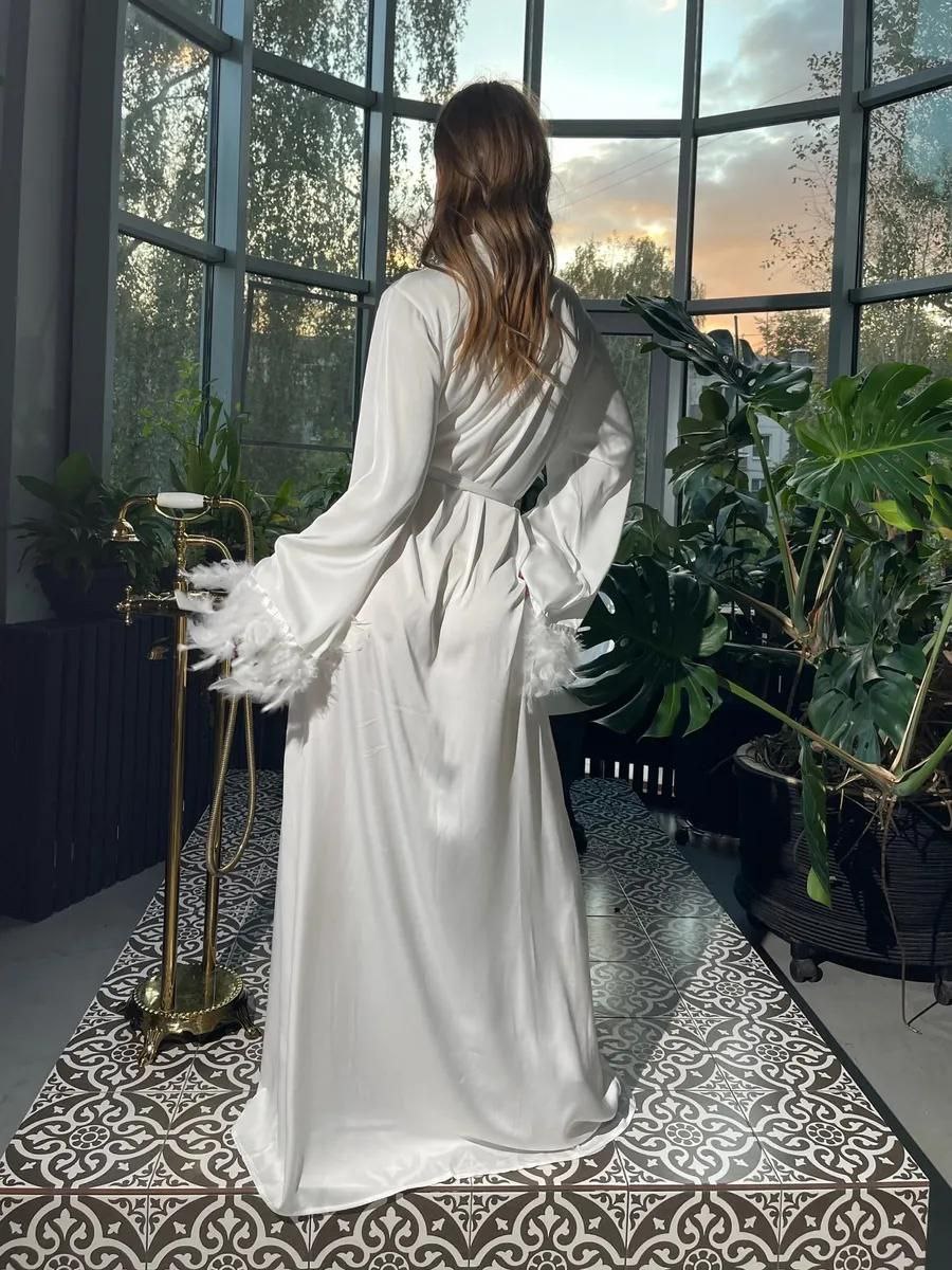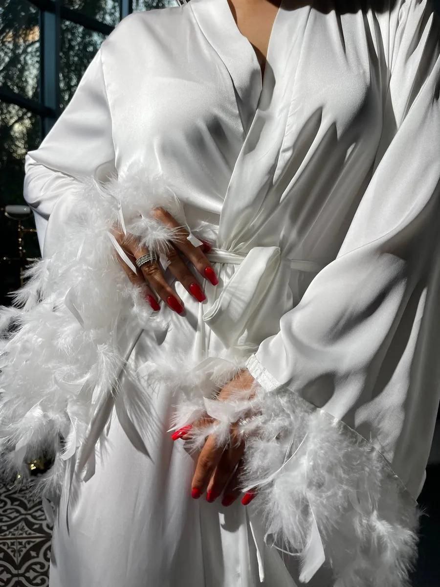 Обираючи цей білий атласний халат із пір’ям, ви додаєте у свій гардероб елемент вишуканості, який одразу робить образ дорогим та елегантним.