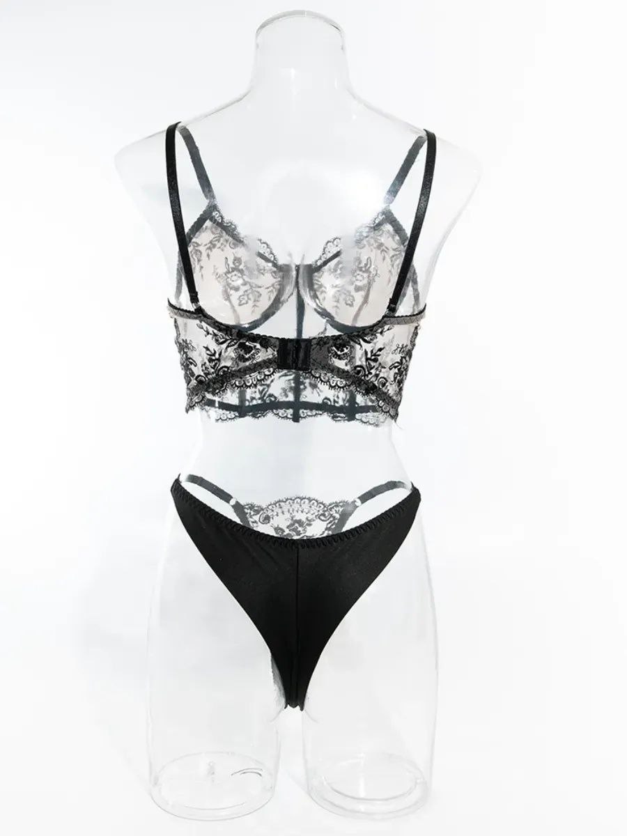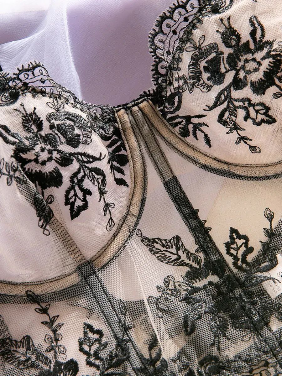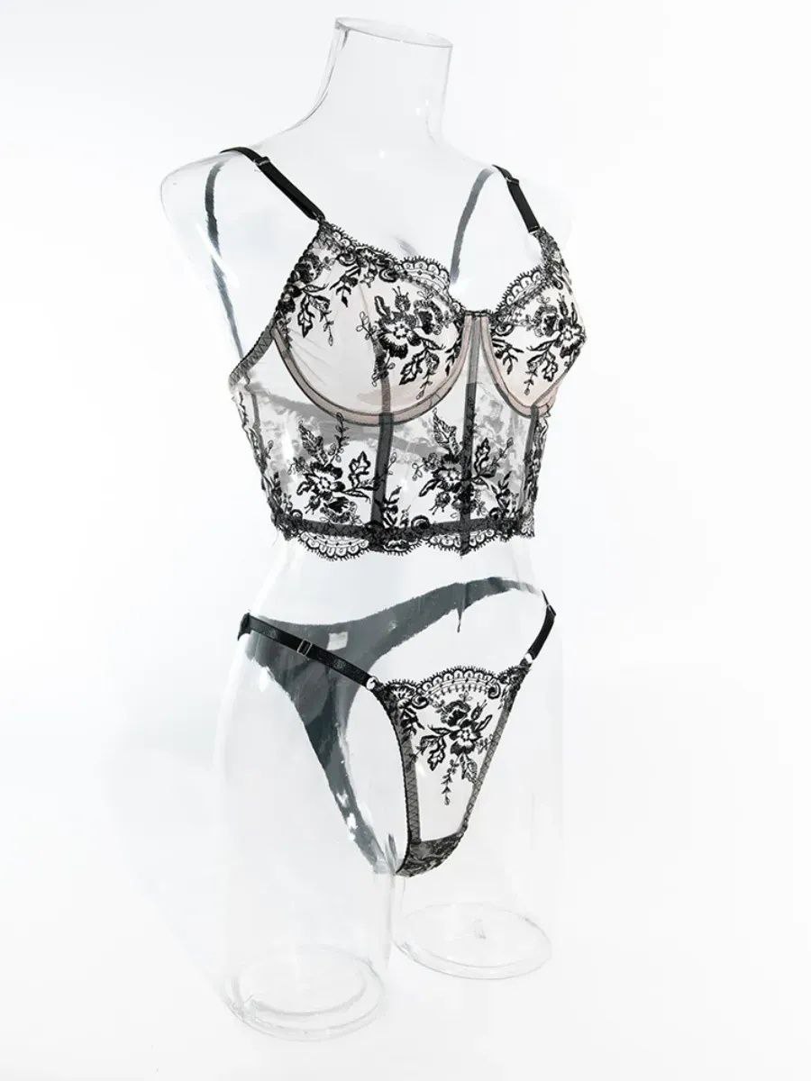 Бюстгальтер корсетного типу з м’якими чашками на кісточках красиво формує груди, забезпечуючи надійну підтримку та вишукану посадку. Напівпрозорі вставки візуально підкреслюють талію та створюють витончений силует. Трусики з тонкими бретелями та мереживним декором делікатно повторюють контури тіла, не сковуючи рухів.