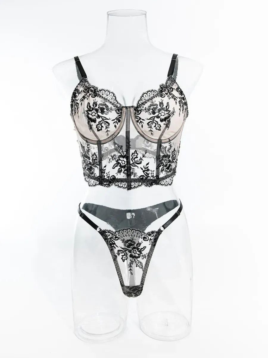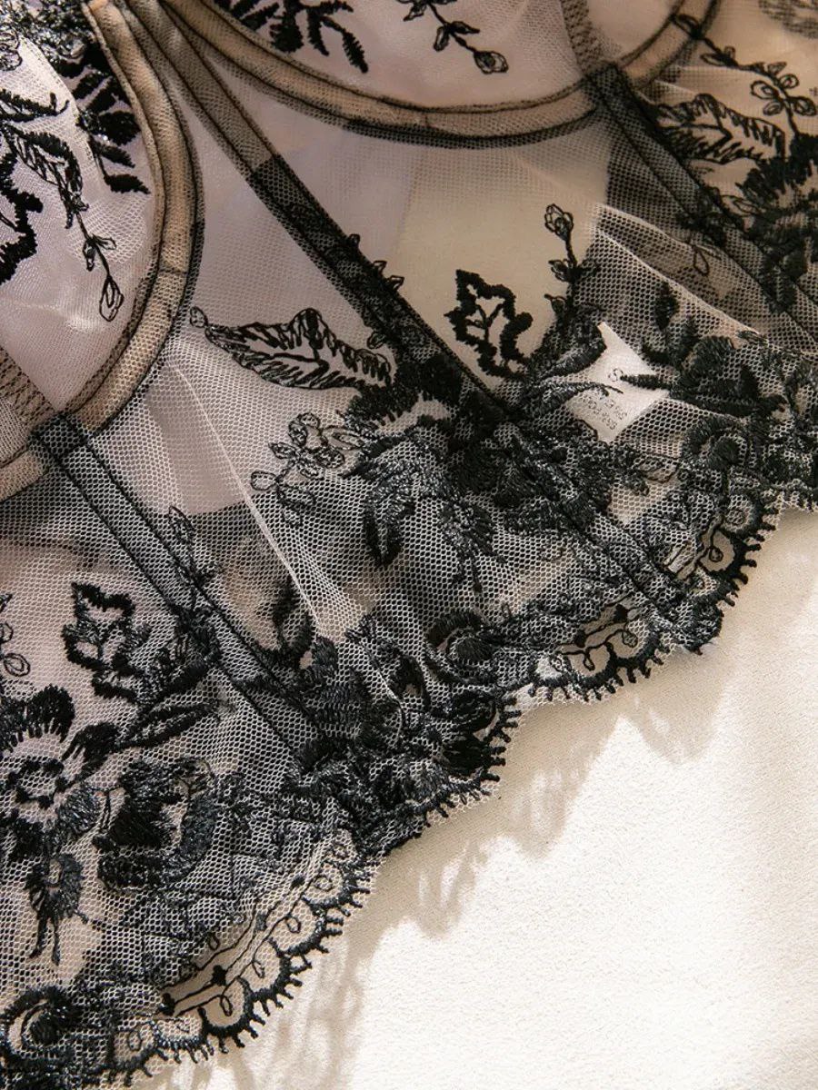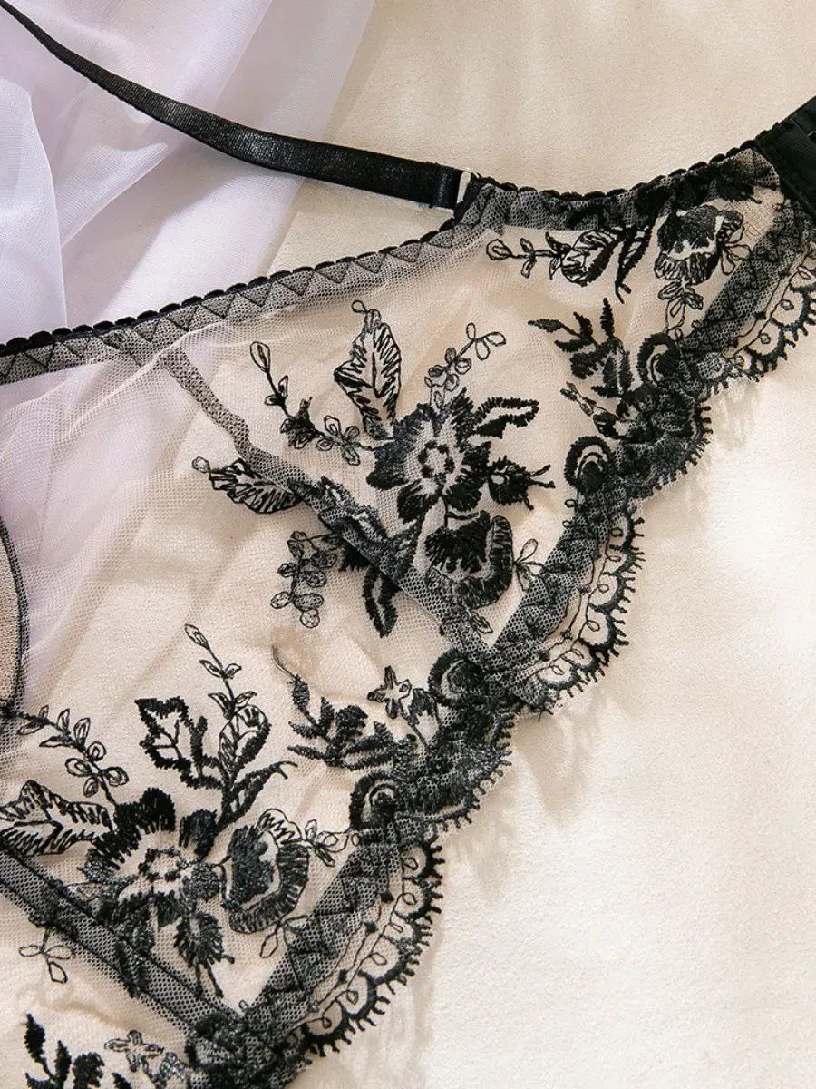 Мереживний комплект білизни Black Whisper — це поєднання витонченості, жіночності та стриманої спокуси. Тілесна основа створює природний ефект «nude», а чорне мереживо з квітковим орнаментом додає образу глибини та елегантного контрасту.