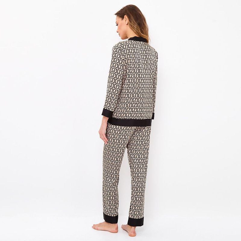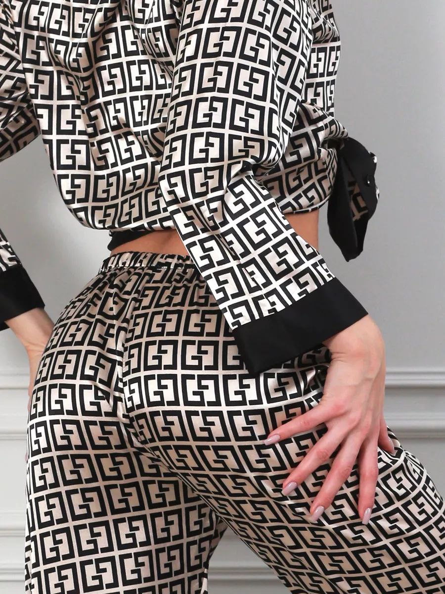 Ця атласна піжама з монограмним принтом створена для жінок, які люблять поєднувати комфорт і преміальний вигляд. М’який атлас приємно огортає тіло, красиво переливається та дарує відчуття доглянутості з ранку до вечора.